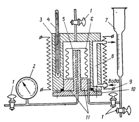 Давление насыщенных паров топлива (метод разработан А. А. Соловьевым и Б. А. Маловым [219]). Определение проводят в специальном сильфонном приборе (рис. 11.1) при температурах от 20 до 200 °С и атмосферном давлении. Испытуемый образец топлива, помещенный в рабочую полость герметичной ячейки, нагревается, и при нагревании в результате повышения давления насыщенных паров топлива происходит сжатие силь-фона 6. Повышение давления в рабочей полости ячейки через сильфон и дегазированное вакуумное масло, полностью заполняющее измерительную полость ячейки, воспринимается измерительным прибором—вакуумметром 2. Перед проведением испытания из ячейки с помощью вакуум-насоса удаляется воздух. Дозатор заполняют испытуемым топливом и в количестве г» 30 мл подают в ячейку, при этом обеспечивается соотношение объемов парогазовой фазы к жидкой, равное 4:1; Включают электронагреватель 9 с помощью регулятора напряжения, нагревают и выдерживают топливо при заданной температуре, при которой фиксируют показания вакуумметра 2.