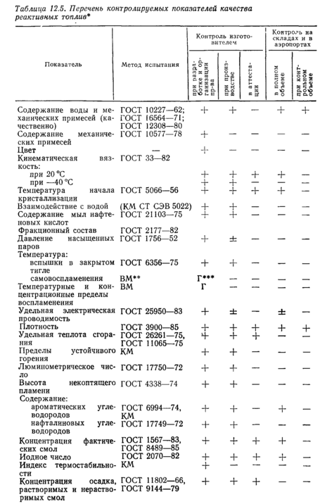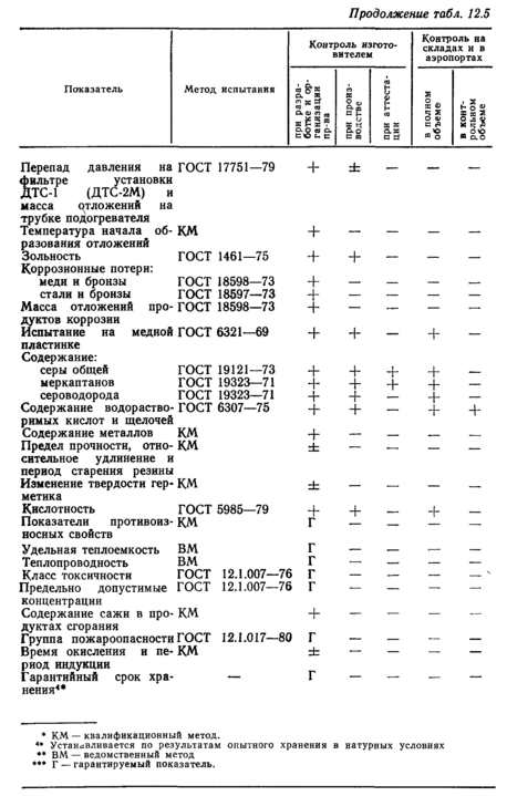Объем испытаний. Перечень показателей качества, определяемых при разработке и организации производства, производстве и аттестации качества реактивных топлив (по ГОСТ 4.25—83), а также при транспортировании, хранении, перекачивании на складах горючего и при заправке авиационной техники, приведен в табл. 12.5.