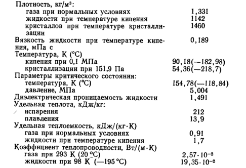 Жидкий кислород представляет собой бледно-синюю прозрачную жидкость, которая при температуре кристаллизации затвердевает в виде кристаллов синего цвета гексагональной формы. Основные физические свойства кислорода [18—21]: