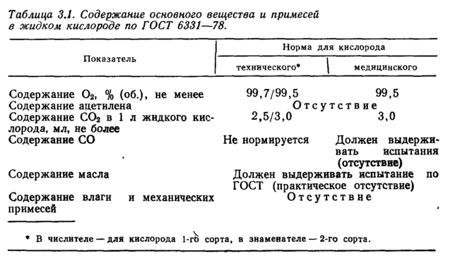 В ракетной технике применяют жидкий кислород с минимальным содержанием примесей. Так, согласно спецификации США MIL-P-25508D (AF) содержание примесей в жидком кислороде не должно превышать 0,5% (в основном азота и аргона), содержание диоксида углерода не нормируется [4]. В Советском Союзе жидкий кислород для различных областей техники выпускают по ГОСТ 6331—78 (табл. 3.1). Отсутствие в жидком кислороде ацетилена и масла обусловливается мерами безопасности.