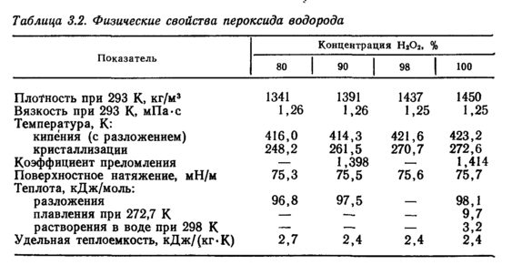Пероксид водорода представляет собой бесцветную прозрачную жидкость. Высококонцентрированные растворы имеют запах, напоминающий запах оксидов азота слабой концентрации. Молекулярная масса Н2О2 равна 34,016. Физические свойства пероксида водорода различной концентрации приведены в табл. 3.2 [3, 10, 14, 28].