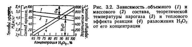 При этом выделяется 47% от массы Н2О2 реакционноактивного кислорода, который вместе с парами воды образует парогаз с температурой 1263—1273 К. Процесс разложения пероксида водорода можно катализировать перманганатом калия или натрия, диоксидом марганца, солями и оксидом железа, медью, серебром и рядом других веществ. Если скорость разложения 90%-го пероксида водорода составляет примерно 1% в год при температуре 303 К, то, применяя катализаторы, можно добиться быстрого разложения Н2О2 в объеме. Так, за 1 с полностью разлагается 1 кг Н2О2 с помощью перманганата калия в сосуде объемом 1 л. Скорость разложения Н2О2 зависит от температуры: с повышением последней она возрастает примерно в 2 раза на каждые 10 °С. Термическое разложение пероксида водорода с использованием катализаторов (как правило, твердых) используют для получения парогаза, необходимого для приведения в действие турбонасосного агрегата ракет (служащего для подачи топлива в двигательную установку) [10, 14]. Характеристики такого парогаза приведены на рис. 3.2.