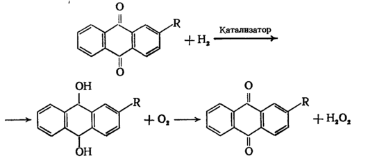 В ракетной технике широкое распространение получил концентрированный пероксид водорода—80—85%-и концентрации [4]. В промышленных масштабах его получают преимущественно антрахинонным методом ( 90% производства Н2О2) [4, 9], Этот метод основан на реакции восстановления алкилантрахинона (этил-, бутил- или пентилантрахинона) до алкилгидроантрахинона и последующем окислении его кислородом воздуха, с образованием пероксида водорода и исходного антрахинона: