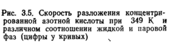 На рис. 3.5 показана скорость разложения концентрированной (100%-и азотной кислоты при 349 К (76 °С) и разном соотношении паровой и жидкой фаз. Скорость разложения азотной кислоты зависит от содержания в ней оксидов азота и воды. Энергия активации при разложении азотной кислоты составляет 117,2—121,4 кДж/моль [4]. При увеличении содержания воды и оксидов азота в ней скорость разложения понижается. Установлено, что дымящая азотная кислота достаточно ста-