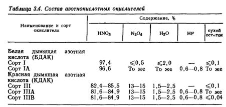 В ракетной технике используют два типа азотнокислотных окислителей: белую и красную дымящие азотные кислоты. Первая представляет собой техническую азотную кислоту с концентрацией НNОз не менее 97,4%, а вторая—смесь азотной кислоты с четырехокисью азота. Состав этих окислителей, согласно спецификации США MIL-N-7254E [4, 10] дан в табл. 3.4. Сорта IA, IIIA и III В содержат небольшое количество HF в качестве ингибитора коррозии. На поверхности металлов фторид водорода образует защитную пленку, предотвращающую коррозию.