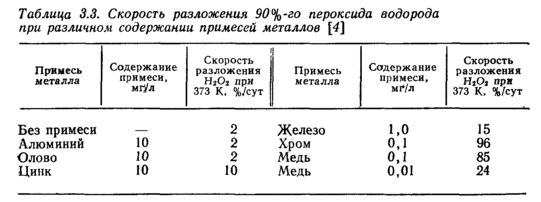 Пероксид водорода высокой чистоты, свободный от каталитических примесей, находящийся в сосуде из каталитически пассивного материала,—весьма стойкий продукт. Снижение концентрации Н2О2 до 90—95% при хранении в таком сосуде при температуре ниже 30 °С составляет примерно 0,5% в год [4]. Для удаления каталитических примесей резервуары, предназначенные для хранения пероксида водорода, подвергают специальной обработке — пассивации.