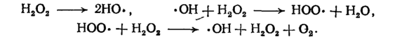 Механизм и скорость разложения различны в зависимости от условий протекания реакции разложения. В паровой фазе начальной стадией является разрыв связи 0—0 в молекуле пероксида водорода, который сопровождается цепными реакциями'[28]: