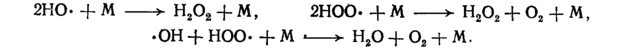 Здесь М—стенка, молекула инертного газа или молекула пероксида водорода, действующие как третье тело [10]. Реакция является полностью гетерогенной до 400 °С или частично гомогенной при температурах выше 425 °С. Изучение разложения пероксида водорода в жидкий фазе показывает, что этот процесс оказывается преимущественно гетерогенным.