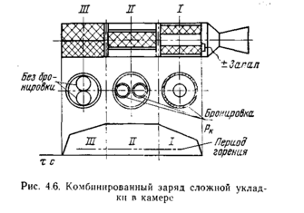 рименяя бронирование и меняя форму зарядов, а также варьируя укладку заряда по длине камеры, можно получить очень сложный характер кривой тяги в зависимости от времени работы двигателя и, таким образом, можно управлять скоростью полета снаряда. Подобный пример показан на рис. 4.6. Здесь заряд разделяется на три участка, каждый из них имеет разную форму и разное бронирование. Первый участок - заряд адгезирован по стенкам камеры и имеет прогрессивное горение за счет внутреннего небронированного канала (см. участок тяги I на рис. 4.6). Второй участок имеет четыре цилиндрических сплошных заряда, бронированных по наружным поверхностям и горящих по торцу. Тяга на втором участке остается постоянной.