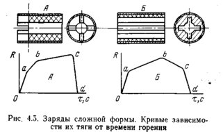 Далее поверхность горения уменьшается, горение дегрессивно и кривая тяги падает до точки d, когда сгорают последние части заряда и тяга прекращается. В заряде А после воспламенения горящая поверхность резко увеличивается за счет крестообразных прорезей - этот участок отмечен на рисунке заряда пунктиром, а на диаграмме тяги по времени соответствует отрезку а—b. Далее до точки с идет прогрессивное горение по внутренней поверхности цилиндрического канала заряда, тяга увеличивается.