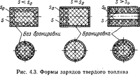 лияние формы заряда и размеров поверхностей горения на характер выгорания топлива, величину давления в камере и на характер кривой тяги двигателя по времени его работы очень велико. С изменением формы заряда меняется газовыделение в единицу времени, а это приводит к изменению давления в камере. Изменение давления в камере, в свою очередь, приводит к изменению тяги двигателя. Меняя форму заряда или размеры поверхности горения, можно в широких пределах менять давление рк и тягу двигателя по времени горения заряда. Если при горении заряда поверхность горения последовательно уменьшается, т. е. имеет место условие s/ s0<1, где s - текущая поверхность горения, a s0 - начальная поверхность горения, то такую поверхность горения называют «дегрессивной». Если при горении заряда поверхность горения увеличивается, т. е. имеет место условие s/s0>1, то такая поверхность называется «прогрессивной». При условии s/s0=1 поверхность называется «нейтральной». Покрытие поверхности заряда слоем негорючего или медленно горящего материала называется бронированием заряда. Бронировка может наноситься на внутреннюю, внешнюю, или торцовую поверхности заряда. Во всех случаях поверхность заряда, покрытая бронировкой, не участвует в процессе горения и не дает газовыделения.