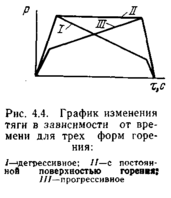 грессивным, s<s0. Кривая зависимости тяги от времени будет иметь вид, показанный на рис. 4.4 участком кривой I (дегрессивное горение).