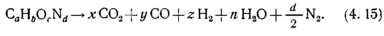 В этой формуле индексы а, b, с и d представляют числа грамм-атомов элементов топлива. Коэффициенты x,y,z,n, d/2 - числа грамм-молекул состава продуктов сгорания.