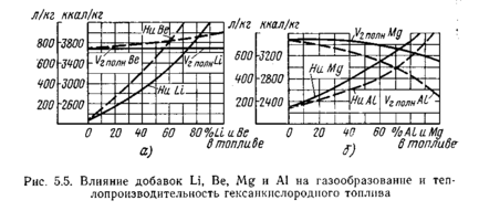 На рис. 5.5 приведены основные показатели топлива на основе гептан — металлического горючего (органозоля) с кислородным окислителем.