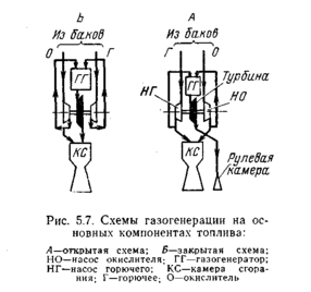 Естественно, что для работы газовой турбины ТНА желательны минимальные колебания температуры и работоспособности генераторного газа. Кроме того, восстановительный газ менее коррозионноактивен по отношению к конструкционным материалам газогенератора, турбины и газоводов. Меньшая коррозионная активность генераторного газа позволяет поднять на 473-573 К (200-300° С) уровень температуры, что, в свою очередь, уменьшает размеры и массу газогенератора и турбины, так как повышается работоспособность газа.