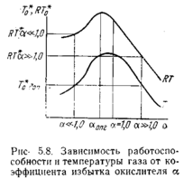 Если произведение газовой постоянной на температуру рассматривать как «работоспособность» газа при данной температуре и построить график изменения RT и Т газа по а, то можно показать, что работоспособность восстановительного газа при заданной температуре будет выше, чем окислительного генераторного газа (рис. 5.8). Из приведенного графика видно, что при одинаковых по величине отклонениях возникают изменения температуры и работоспособности газа - рабочего тела турбины. Но для восстановительного газа отклонения ДГ и RT значительно меньше, чем для газа окислительного [1,2]. Отклонения , T и RT взаимосвязаны и являются результатом колебаний расхода компонентов топлива, вызванных процессом регулирования двигателя.