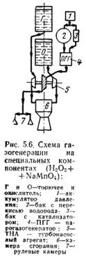 данном случае в продуктах реакции будут газ - кислород и водяной пар. Реакция осуществляется в парогазогенераторе (ПГГ) с выделением тепла (2,845 МДж/кг Н2О2), и рабочее тело - парогаз имеет температуру около 675-775 К (402-502° С).