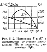 Вторая фаза реакции - диссоциация аммиака на азот и водород протекает с поглощением тепла, но общий баланс тепловыделения положительный, хотя избыток тепла незначителен. Характер протекания реакции разложения гидразина сказывается на величине температуры газа, и конструкция газогенератора должна обеспечивать развитие реакции разложения до желаемых пределов диссоциации аммиака. Расчеты, проведенные в предположении равновесия, показывают, что первая фаза реакции обеспечивает температуру до 1575 К. При полном разложении гидразина и полной диссоциации аммиака температура газа может снизиться до 875 К, но при этом в продуктах реакции будет довольно много водо-рода. Опираясь на график (рис. 5.12), можно показать, что изменение работоспособности газа RT в за-висимости от степени диссоциации аммиака х в пределах от 0,0 до 0,8 не превышает 7%. В то же время изменение температуры газа весьма значительно и достигает перепада около 600°. Указанные изменения температуры ориентировочны потому, что условия химического равновесия, принятые в расчетах, едва ли могут быть выдержаны из-за очень малого, около 0,01 с, времени пре-бывания гидразина в рабочей зоне газогенератора. Отсюда следует, что, воздействуя на время пребывания гидразина в зоне разложения, можно в довольно широких пределах регулировать температуру генераторного газа, практически от 975 до 1400 К. Время пребывания гидразина в газогенераторе обычно зависит от конструкции газогенератора - объема камеры, длины пути тазов и жидких компонентов, величины первоначального теплового импульса и т. д. [2 , 40].