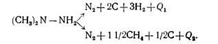 Несимметричный диметилгидразин так же, как и гидразин, при нагреве до 625 К разлагается [35, 40]. Начало разложения наблюдается при температуре в 400 К (127° С). С увеличением температуры увеличивается интенсивность разложения и при температуре разложения около 775 К (500° С) происходит взрыв. Разложение диметилгидразина идет в условиях сопряженных реакций по следующей схеме: