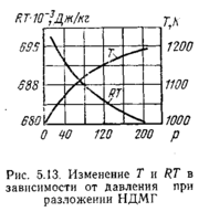 Удлинение времени пребывания НДМГ в газогенераторе приводит к развитию диссоциации и увеличению доли водорода - это положительное явление. Но удлинение времени пребывания НДМГ увеличивает выделение твердого углерода, а это вредно, так как отложения сажи уменьшают сечения газоводов. Пои этом нарушается нормальный режим работы газогенератора. На показатели генераторного газа, полученного при разложении диметилгидразина, влияет величина давления в газогенераторе. С увеличением давления заметно растет температура, а работоспособность газа незначительно падает (рис. 5.13). Это связано с уменьшением диссоциации продуктов разложения при повышении давления.