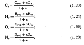 Для частного случая, например, когда в топливе присутствуют только углерод, водород, кислород и азот, обозначив относительные массовые доли химическими индексами этих элементов, можно записать удобные расчетные формулы: