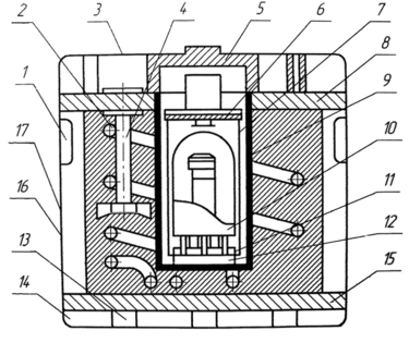 1 – ручка откидная, 2- змеевик, 3- крышка, 4 – мешалка оболочки, 5- крышка эбонитовая, 6 – крышка, 7 – калориметрический сосуд, 8 – плита текстолитовая верхняя, 9 – гнездо сосуда, 10 – калориметрическая бомба, 11 – металлическая опора, 12 – подставка, 13 – ножки, 14 – поддон, 15 – плита текстолитовая нижняя, 16 – кожух, 17 - оболочка