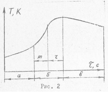 Главный период считают законченным с наступлением равномeрного изменения температуры воды в калориметрическом сосуде, о полуминутные пpoмежутки с равномерным изменением температуры относят к конечному периоду. За последним отсчетом главного периода непосредственно следует первый полуминутный промежуток конечного периода. Всего к конечному периоду относят примерно 10 отсчетов по шкале термометра, следующих через полминуты и показывающих равномерное изменение температуры калориметрической системы. На рис. 2 схематически представлена кривая изменения температуры воды в калориметрическом сосуде по времени.