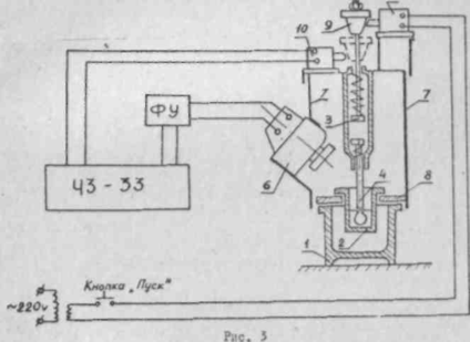 прибором ЧЗ-33. Излучение, появившееся в момент воспламенения горючей смеси, воздействует на фотодиод, который через фотоусилитель ФУ вырабатывает электрический импульс. Последний поступает в прибор ЧЗ-33 и прекращает отсчет времени. Значение полученного