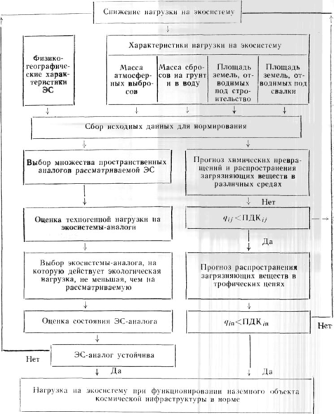 Учитывая специфику воздействия наземных элементов космической инфраструктуры на природную среду, нагрузку на экосистему было бы целесообразно характеризовать суммарными среднегодовыми показателями приведенной массы загрязняющих веществ, выбрасываемых в атмосферу, сбрасываемых на грунт и в воду, а также площадями земель, отводимых под строительство, свалки, полигоны захоронения отходов и т. п. Суть экологического нормирования в конечном счете заключается в выборе приемлемых из перечисленных выше показателен. Далее параллельно осуществляется санитарно-гигиеническая и экосистемная оценка допустимости прогнозируемой