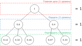 У каждой цели указывается, какой процент ресурсов будет на неё направлен. Сумма процентов распределения ресурсов по всем целям (по уровням) равна 100% (единице).