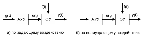 На рисунке 1.3 б основой управления является метод компенсации, когда система непосредственно воздействует на причину динамических изменений регулируемого параметра, а именно на возмущение f(t), действующее на объект. АУУ использует информацию о текущем значении возмущающего воздействия и вырабатывает сигнал, компенсирующий (устраняющий) возможные отклонения регулируемой величины: