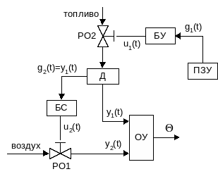 Для решения второй задачи реализована следящая САР по каналу «изменение расхода воздуха – изменение температуры в печи». Здесь задающее воздействие g2(t) является неизвестной функцией времени, зависящей от соотношения текущего расхода топлива, измеряемого с помощью датчика (Д). Задание по этому каналу управления рассчитывается в блоке соотношения (БС).