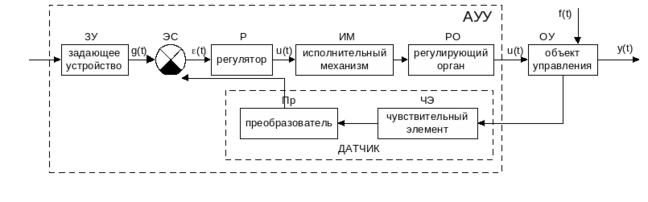 На рисунке 1.1 представлена функциональная схема (ФС) САР, которая состоит из объекта управления и автоматического управляющего устройства (АУУ), выполняющего функции оператора при замене ручного управления на автоматическое.