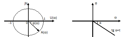 АФХ представляет собой окружность радиуса R=1 и центром в начале координат. При w=0 вектор расположен положительной вещественной оси, с ростом частоты он поворачивается по часовой стрелке и при ω=2π/τ возвращается в исходное положение. При бесконечном увеличении частоты, вектор бесконечное число раз поворачивается вокруг начала координат.