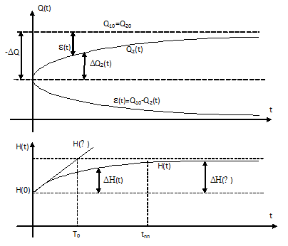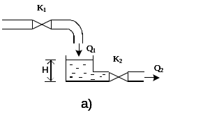 Поскольку расход стал меньше притока, уровень воды в бассейне начнёт возрастать (рис10.1в). Увеличение столба жидкости ведёт к повышению давления на выходе из бассейна, поэтому расход Q2 будет увеличиваться по мере роста уровня.