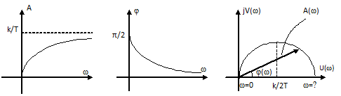 Тогда АЧХ: A(ω) = kω; ФЧХ: φ(ω) = π/2; ВЧХ: U(ω) = 0; МЧХ: V(ω) = ωk.