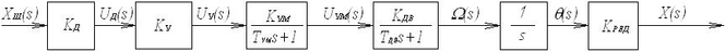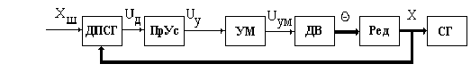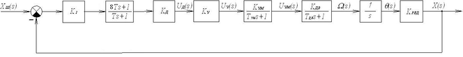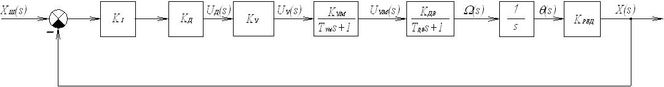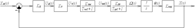 Для перемещения сварочной головки на заданное расстояние на вход системы подается текущее значение координаты сварного шва. Разница этого значения и фактического значения координаты сварочной головки из цепи обратной связи (отработанный сигнал) проходит датчик положения и преобразуется в напряжение. Оно подается на предварительный усилитель. Далее сигнал корректируется, чтобы добиться желаемого качества системы. Затем сигнал усиливается усилителем мощности. Усиленный сигнал подается на двигатель, в результате чего ротор двигателя начинает вращаться и приводит в движение (через редуктор, преобразующий вращательное движение ротора двигателя в поступательное движение сварочной головки) сварочную головку.