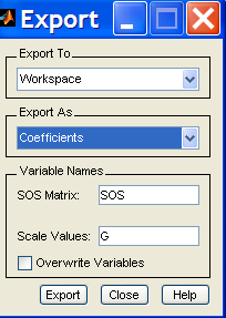 Экспорт полученной структуры фильтра в Workspace производится командой File/Export. Если экспортируется некаскадная структура, запрос имеет форму, показанную на рис. 3.