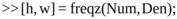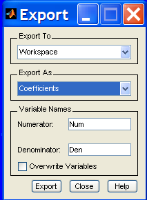 В окне Export As рекомендуется указать Coefficient. Тогда переменные Num и Den передадутся как вектора составленные из коэффициентов числителя и знаменателя передаточной функции фильтра. Эти переменные можно использовать в командах. Например, при выводе графика АЧХ