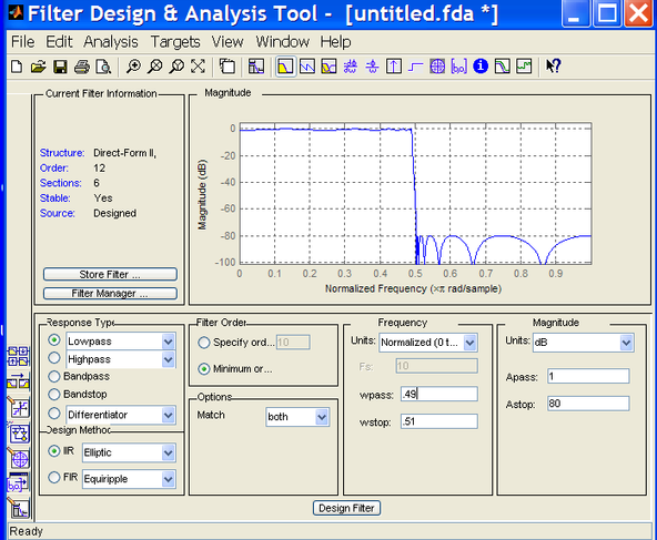 Окно Filter Design является удобным мощным инструментом проектирования дискретных фильтров. В MATLABе окно вызывается командой