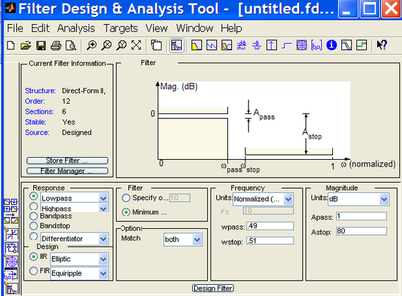 Важные результаты указаны в верхнем левом углу окна. Порядок фильтра равен 12 и он устойчив (эти же результаты можно вывести пиктограммой I).