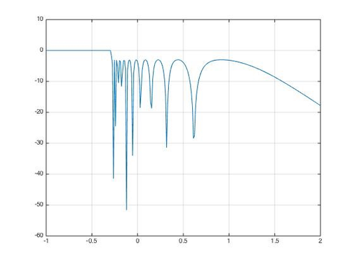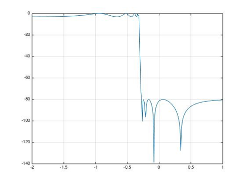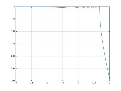 >> plot (log10(w),20.*log10(abs(A))),grid