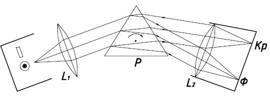 Стилоскоп (рис.1) состоит из электрической и оптической системы. Электрическая система обеспечивает возбуждение и стабилизацию дугового или искрового разряда между исследуемым объектом и стандартным электродом, выполненным из меди. Электрический разряд имеет малую силу тока (2 или 4 А), но высокое напряжение. Под воздействием теплоты разряда происходит термическая ионизация паров разряда и выделение энергии в виде света с определенной для данного элемента длиной волны. Выделенная световая энергия поступает в оптическую часть стилоскопа (рис.2), где она превращается в параллельные лучи, а затем поступает в трехгранную линзу. Степень преломления луча в линзе пропорциональна длине волны. Это позволяет разделить луч света на отдельные составляющие, т.е. получить спектр. Для просмотра отдельных частей спектра предусмотрен поворотны трехгранной линзы (рис.2).