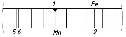 . При этом на экране стилоскопа необходимо добиться идентичного изображения с прилагаемым рисунком. Реперами служат две группы тонких двойных темных линий в правом краю экрана. В середине экрана при этом выявляется более широкая темная линия 2(железо), пропорциональная содержанию железа в стали, а левее линия 1 (марганца), интенсивность затемнения которой следует сравнить с линией железа для каждого исследуемого образца.