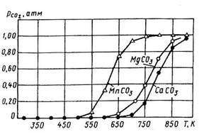 Рис.8.7. Влияние температуры на равновесное давление рСО2 при диссоциации карбонатов CaCO3; MgCO3; MnCO3.