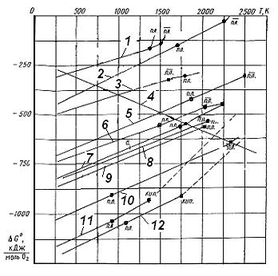Рис.8.11. Влияние температуры на изменение приращения ΔG0 реакций диссоциации различных оксидов, приходящегося на 1 моль О2: 1-CaO; 2-MgO; 3-Al2O3; 4-CO; 5-ZrO2; 6-B2O3; 7-TiO2; 8-SiO2; 9-MnO; 10-FeO; 11-WO3; 12-MoO3 токами отмечена температура плавления оксидов.