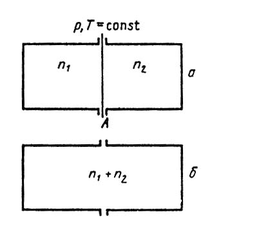 Рис.8.4. Объем с двумя газами до (а) и после их смешения (б).