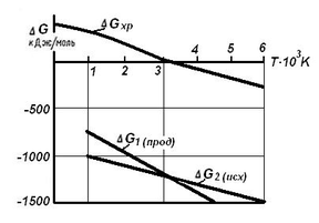 Рис.8.5. Соотношение ΔGхр, ΔG1, ΔG2, исходных продуктов и реакции SiO2+2Fe ↔2FeO+Si при различных температурах.