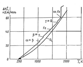 Рис.8.2. Приращение энтальпии ΔНf0 при увеличении температуры для Fe и О2.