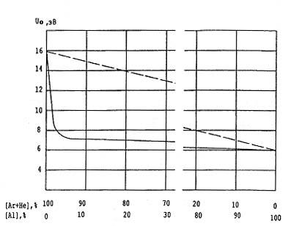 Рис.8.9. Изменение U0- эффективного потенциала ионизации смеси (аргон-гелий + пары алюминия) от их концентрации.